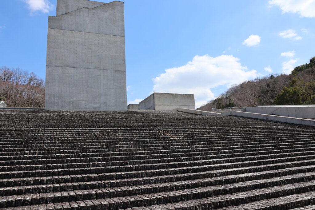 古墳時代の遺物を中心に展示されています。数年前、リポビタンDのCMで木村拓哉さんがこの階段に座っていました。当時は聖地巡礼の人がたくさん来て座っていました。右奥の里山には小さな古墳が多数点在しており、露出した玄室に入ったりすることもできます。
