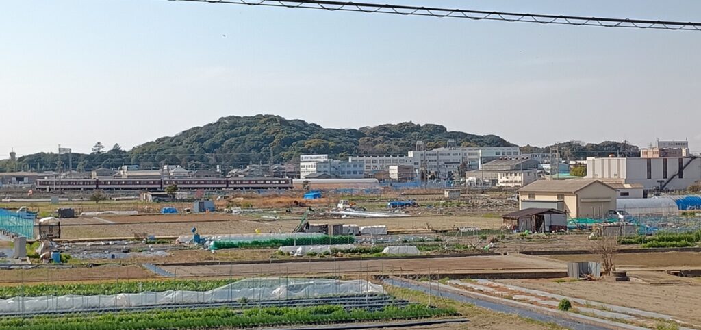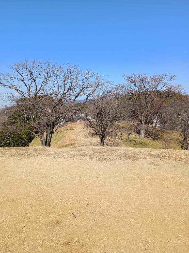 公園化され散策できる古墳もいくつかあります。写真は全方後円墳の丸い部分(後円)から四角くなっている部分(前方)を撮ったものです。