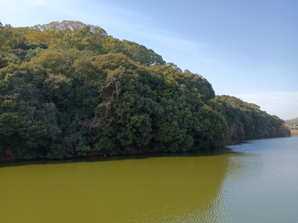 仁徳天皇陵に次ぐ大きさです。写真は中央部くらいから長軸方向に撮っています。古墳の弱点はそばに行くと全体像が見えないことで、世界遺産登録後も観光客はそれほど多くありません。